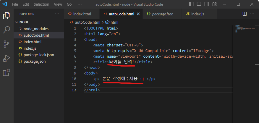 vs code 에서는 단축키를 통해서 html5 기본 구조를 바로 작성해 줄 수가 있습니다.