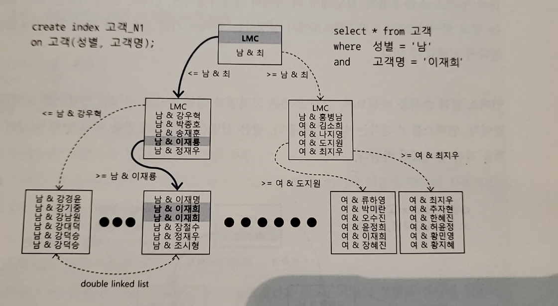루트블록에서 찾고자 하는 값(남자 이재희)보다 큰 첫 번째 레코드를 만나게 된다. 그게 남&최 레코드다. 그 레코드 바로 직전 레코드인 LMC 가 가리키는 블록으로 넘어간다. 브랜치 블록에서 남자 이재희보다 큰 블록을 찾는다. 그 레코드는 바로 남&정재우 레코드다. 바로 직전 레코드인 '남&이재룡'이 가리키는 리프 블록으로 넘어간다. 블록 안에서 남자 이재희를 찾는다.(수직적 탐색)