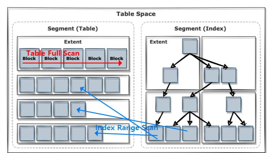 | - 인덱스 구조를 따라 스캔 - 결과 집합 순서 보장 - Single Block I/O - 파티션 돼 있지 않다면 병렬스캔 불가 - 인덱스에 포함되지 않은 컬럼 조회 시에도 사용 가능 | - 세그먼트 전체를 스캔 - 결과집합 순서 보장 안됨 - Multiblock I/O - 병렬 스캔 가능 - 인덱스에 포함된 컬럼으로만 조회할 때 사용 가능 |