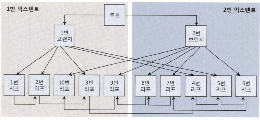 Multiblock I/O 방식으로 왼쪽 익스텐트에서 1번 리프 → 2번 리프 → 10번 리프 → 3번 리프 → 9번 리프 를 읽고, 그 다음 오른쪽 익스텐트에서 8번 리프 → 7번 리프 → 4번 리프 → 5번 리프 → 6번 리프 순서로 읽는다.